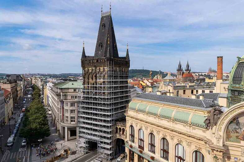 Kruttporten, et historisk gotisk tårn i Praha, gjennomgår en utvendig renovering som startet sommeren 2024, med grundig rengjøring, reparasjon, restaurering og utskifting av skadede deler. HAKI Slovakia, sammen med HAKI Safety-eide EKRO CZ, leverte et bredt spekter av sikkerhetsløsninger til Prague City Tourism, blant annet Universal-stillaser, sikkerhetsnett og mobile gjerder. HAKIs tjenester, som tekniske tegninger og opplæring på stedet, ble også benyttet.