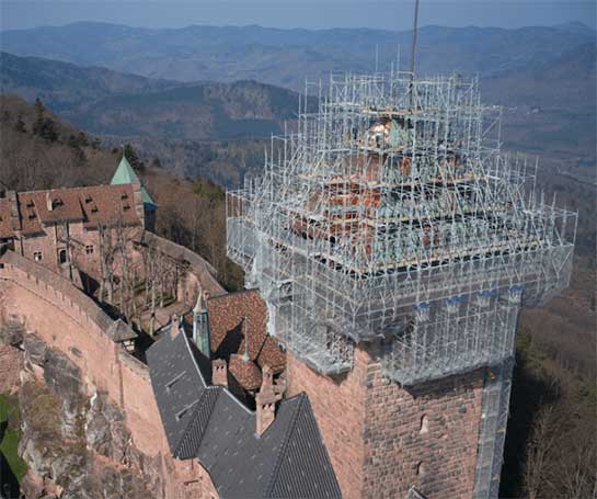 HAKI stillaser kan ta deg til store høyder med deres allsidighet, lette vekt og sikkerhet. Sjekk denne enestående jobben høyt oppe på toppen av fjellet Château du Haut-Køningsbourg in Orchwiller, 50 km sør for Strasbourg i Frankrike.