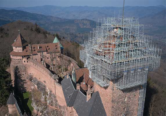 HAKI stillaser kan ta deg til store høyder med deres allsidighet, lette vekt og sikkerhet. Sjekk denne enestående jobben høyt oppe på toppen av fjellet Château du Haut-Køningsbourg in Orchwiller, 50 km sør for Strasbourg i Frankrike.